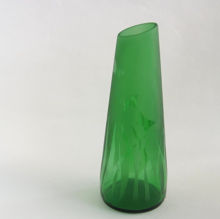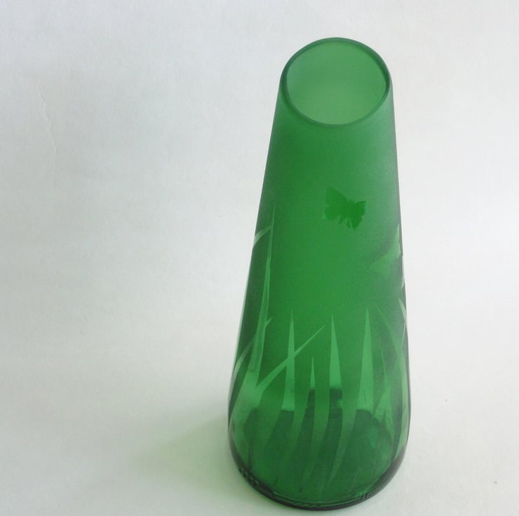 I took advantage of the unusual tapering shape of the bottle by cutting the top off at an angle before polishing the edges until smooth. Then I sandblasted the bottle leaving a design of butterflies amid long waving blades of grass.