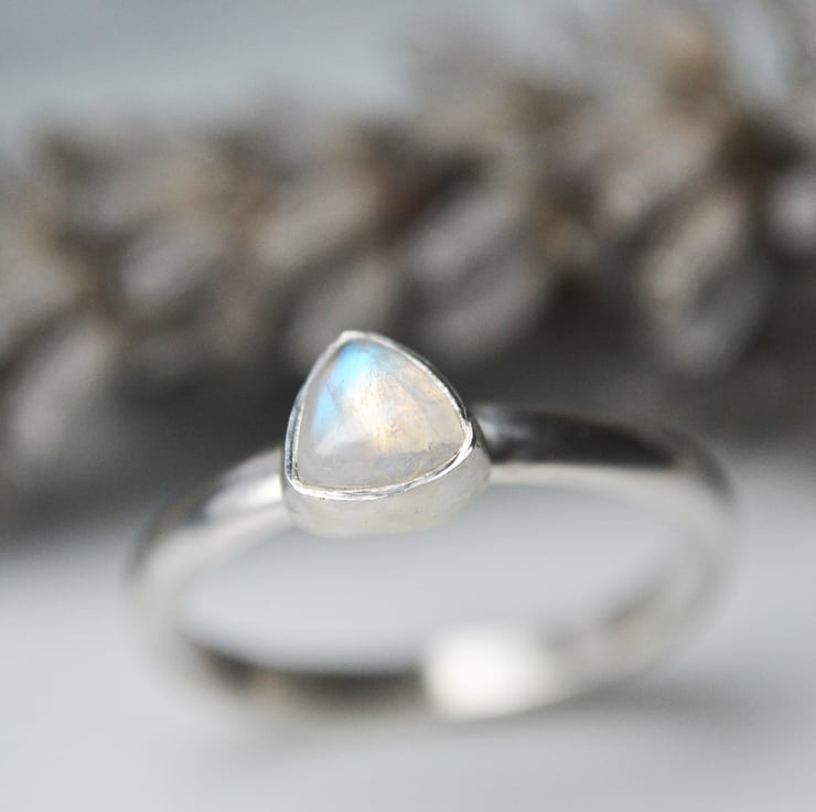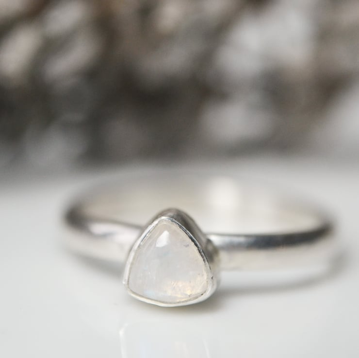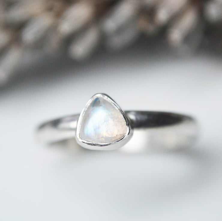 This moonstone trillion cabochon is 5x5mm and has a beautiful blue flash when it catches the light. This ring is perfect to stack with other rings in my collection, and if you are putting together a birthstone stack - Moonstone is the perfect alternative birthstone for June. I tend to use moonstone for June rather than pearl, as it is so much stronger and more durable.
