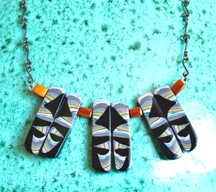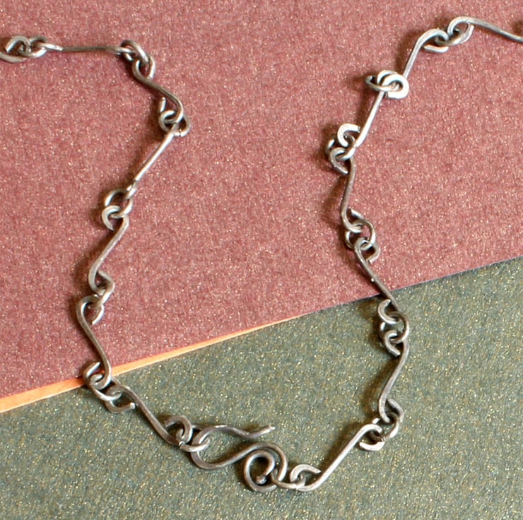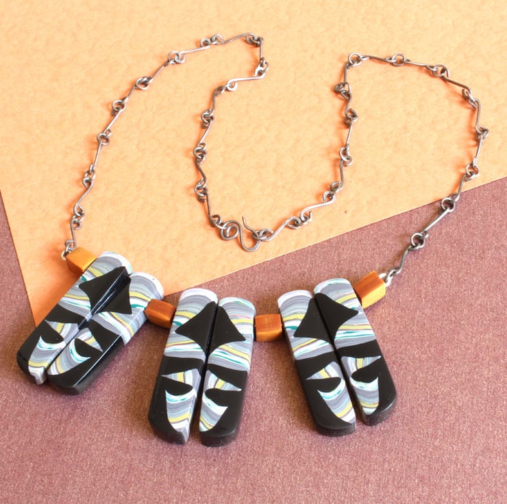 Striking and intricate patterned beads, created by myself, are set on a silver wire to give this attractive pendant. This is hung on a delicate looking silver link chain. These links have been darkened to a shined grey tone.