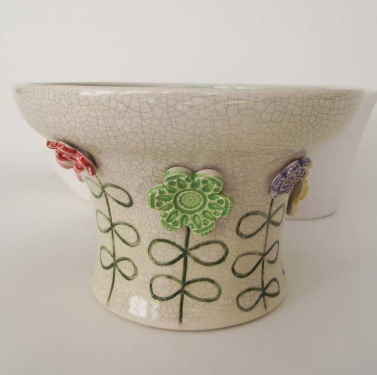 This ceramic bowl has been hand thrown from white earthenware clay. It is finished on the outside with a crackle glaze and on the inside with a bright, glossy glaze.