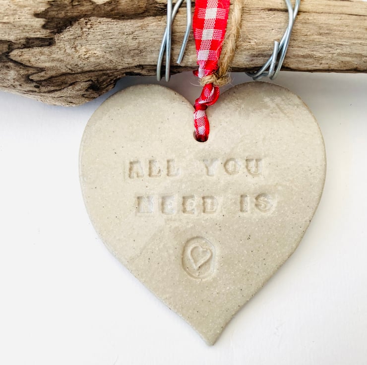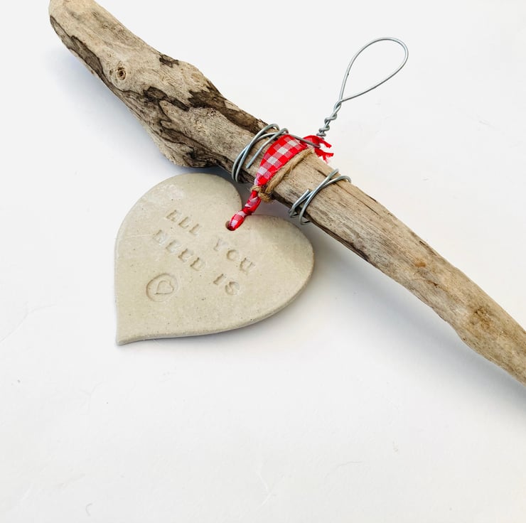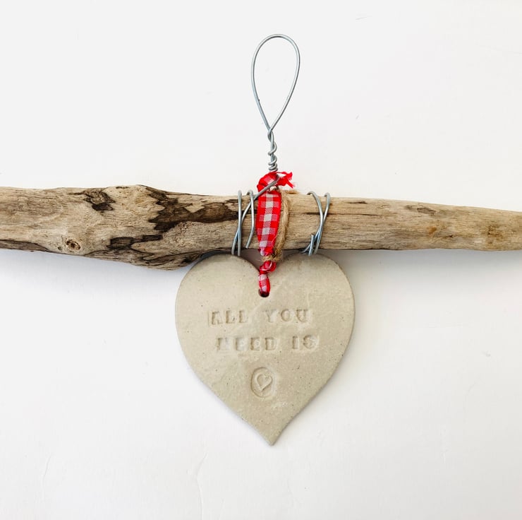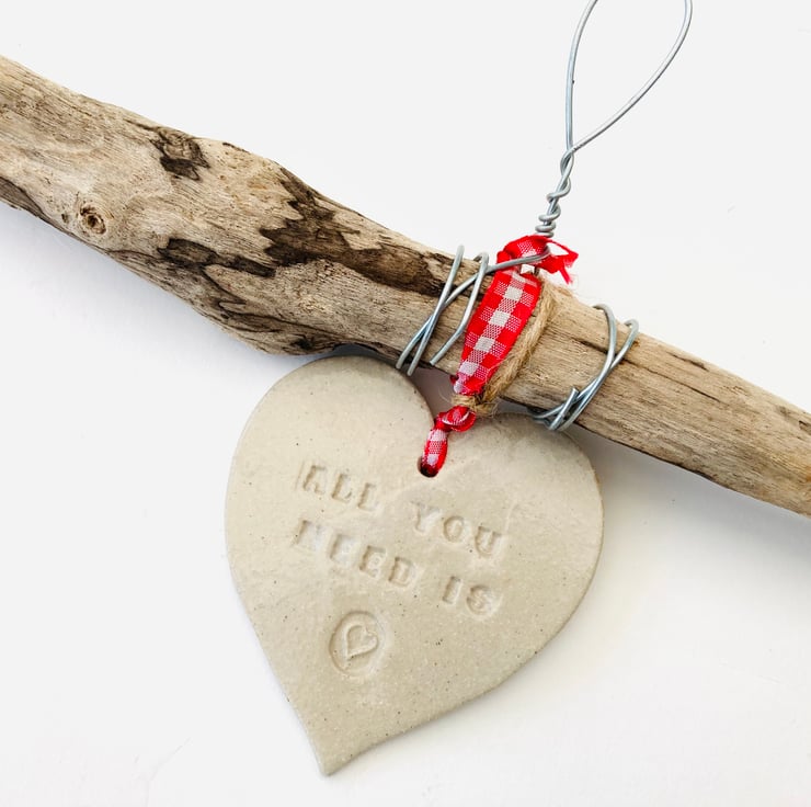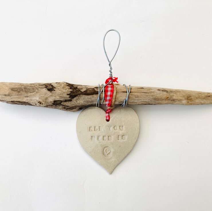 This beautiful driftwood Loveheart hanger is made purely by hand. The Loveheart says 'all you need is love'. The Loveheart is glazed with a cream glaze colour.