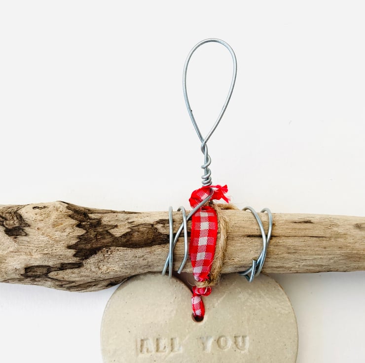 It is hung with wire and attached with natural twine. The Loveheart is attached by a red and white gingham ribbon.