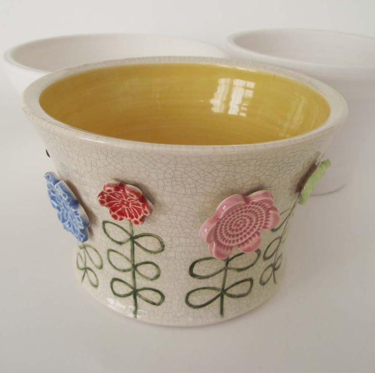 This ceramic bowl has been hand thrown from white earthenware clay. It is finished on the outside with a crackle glaze and on the inside with a bright, glossy glaze.