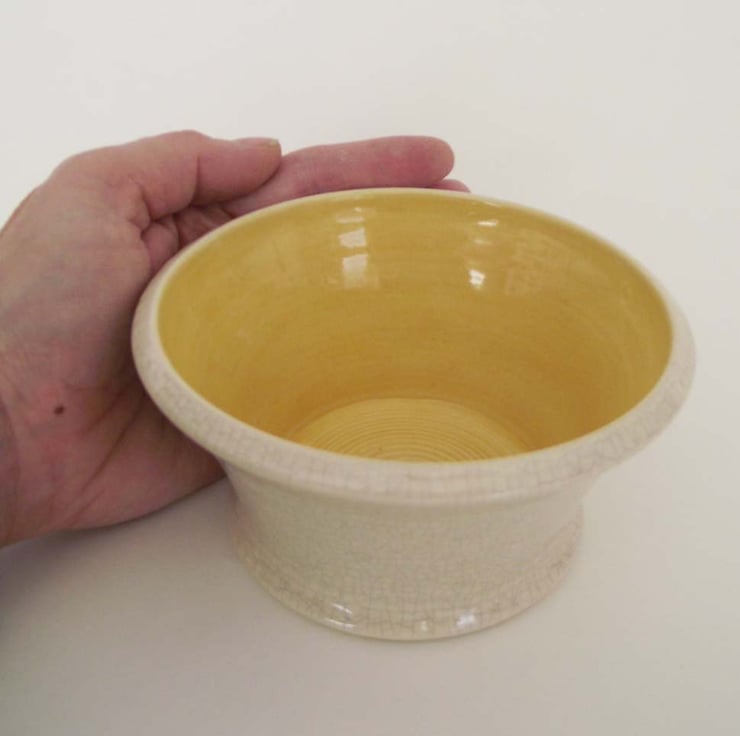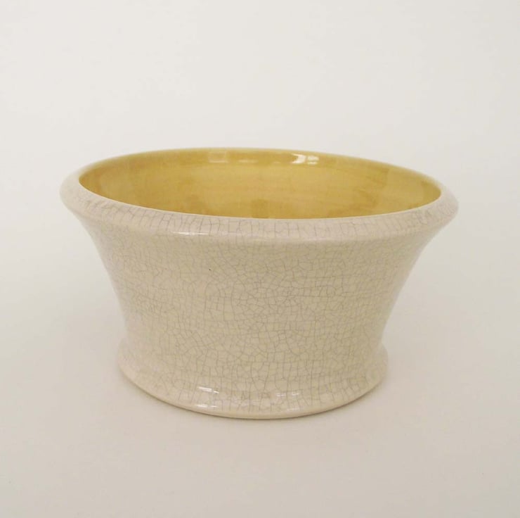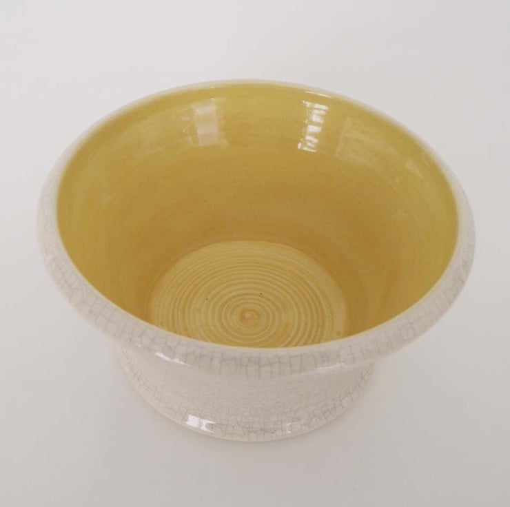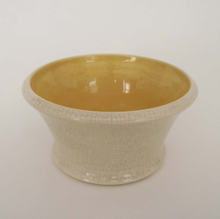 This ceramic pot has been hand thrown from white earthenware clay. It is finished on the outside with a crackle glaze and on the inside with a bright, glossy glaze.