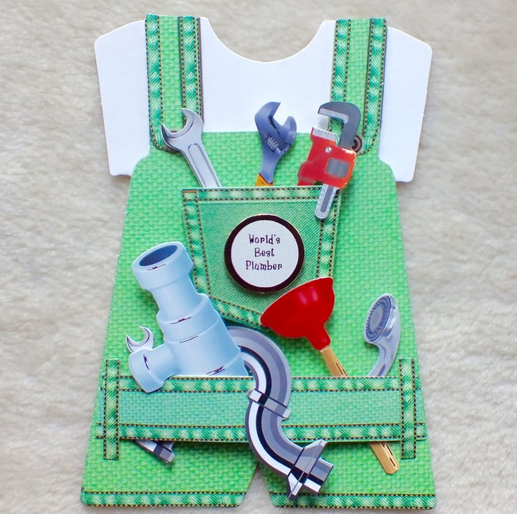 Say a special happy birthday or thank you with this 3D, plumber's card. Embellished with plumber's tools. Approx. 7"x5" in size, it has been left blank on the reverse for your own message. Made using premium quality card stock.