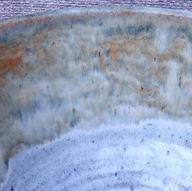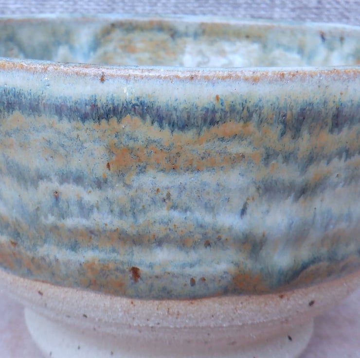 This chawan was wheelthrown by me using strong off-white speckled stoneware clay and finished in a difficult to describe glaze combination.