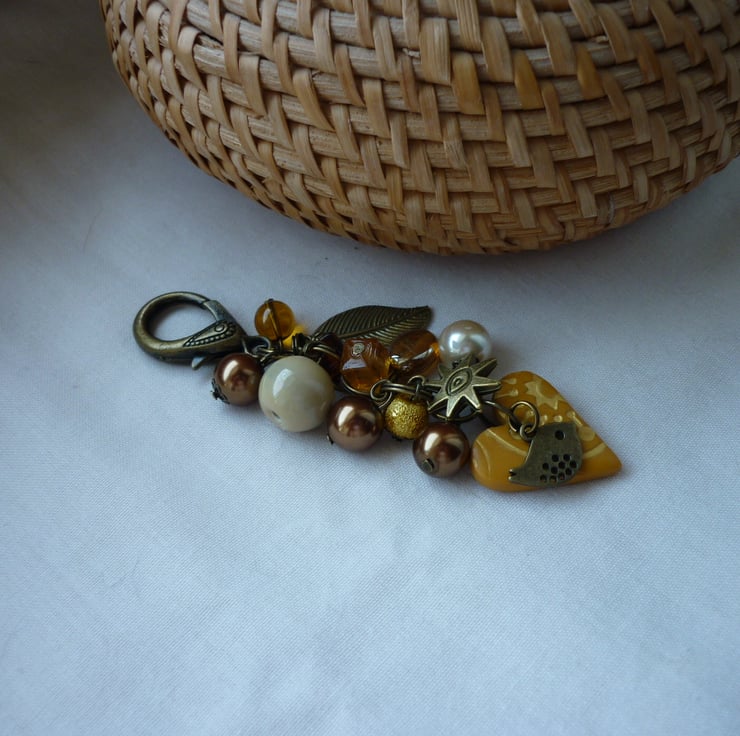 THE HANDBAG CHARM HAS BEEN MADE USING A SINGLE POLYMER CLAY SHAPED HEART IN GOLD ALONG WITH A SELECTION OF GLASS BEADS IN BROWN AND BEIGE, BRONZE CHARMS AND FINISHED WITH A LARGE FANCY BRONZE LOBSTER CLASP.