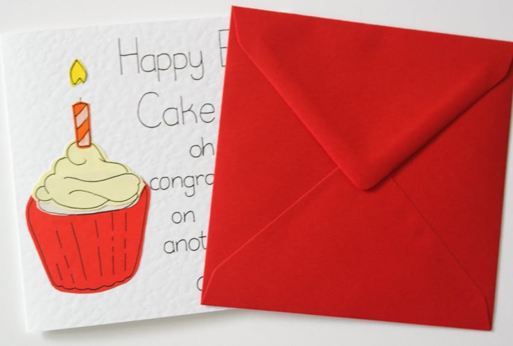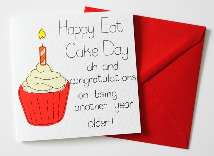 Greeting on front: Happy Eat Cake Day oh and congratulations on being another year older !