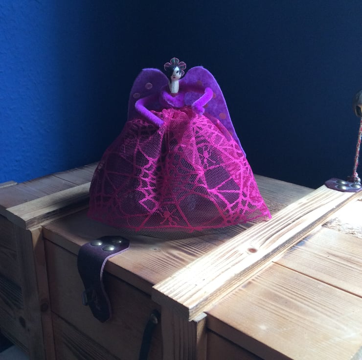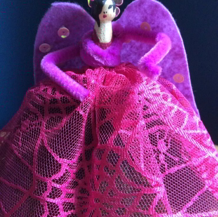 Beautiful handmade peg dolly Christmas tree angel resplendent in a spiderweb dress. Have a very emo Christmas!