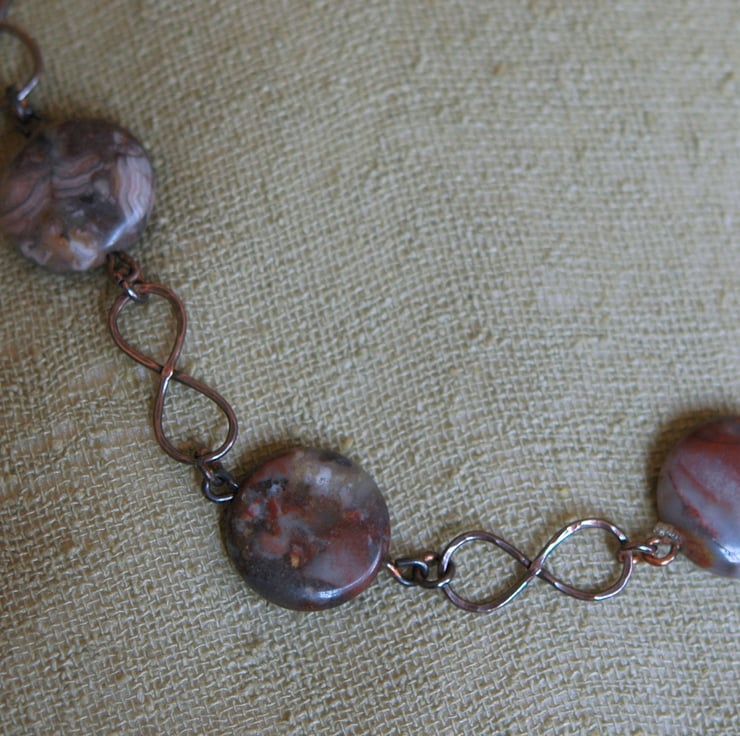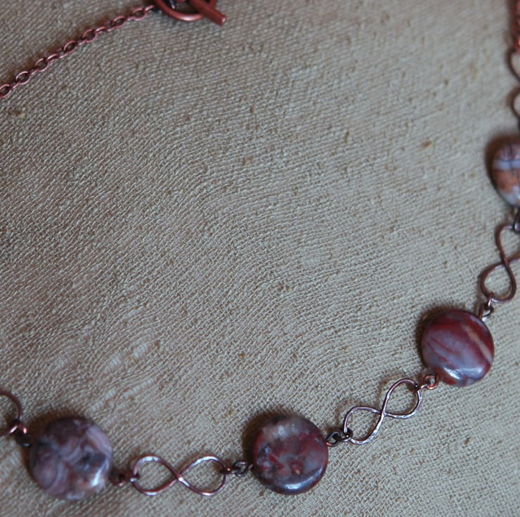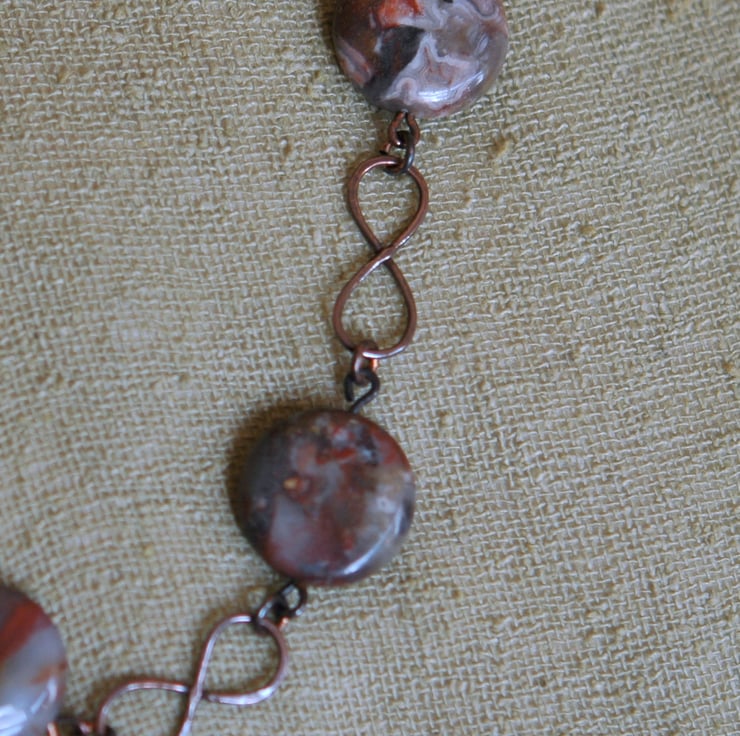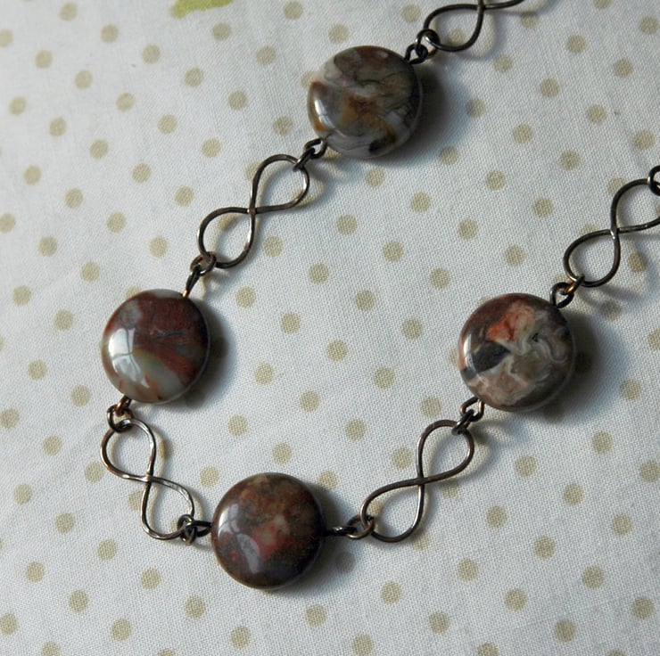 This gorgeous necklace features beads of crazy agate, randomly patterned in rich autumnal colours of russet brown, deep burgundy red and beige. The beads are 2cm in diameter, mounted on copper wire and linked by figure-of-eight infinity symbols. I have soldered these links, forged them with a ball-pein hammer and treated them with oxidising agent to darken them to an antique bronze patina which complements the hues in the stone. For the fastening I have used copper plated chain and an ornate toggle and ring clasp which is easy to open and close but remains secure while you are wearing it.