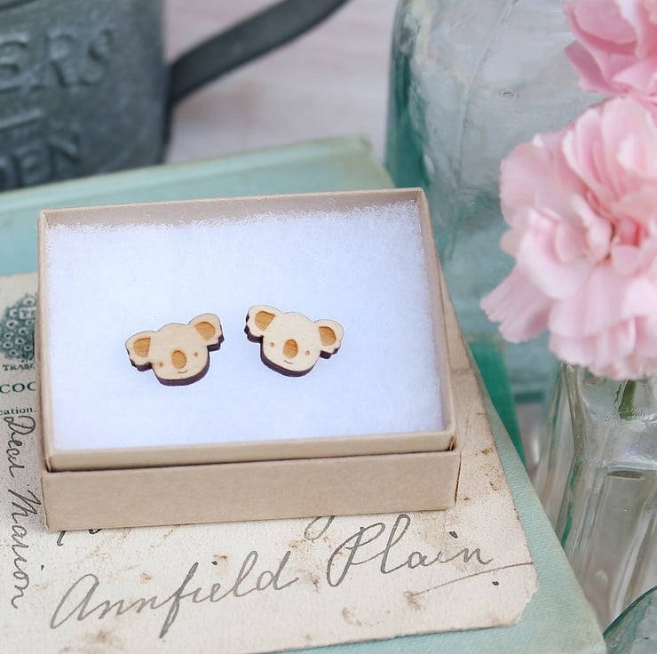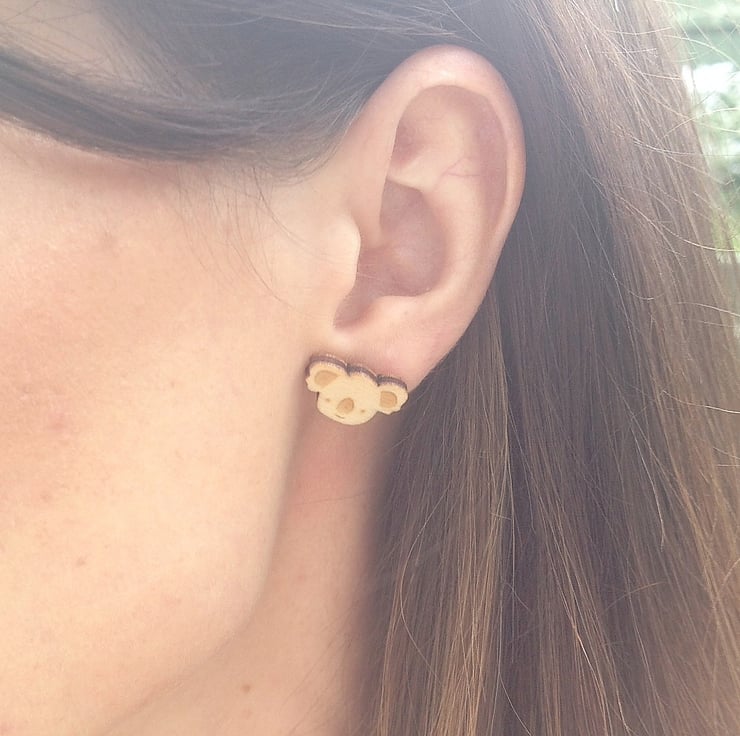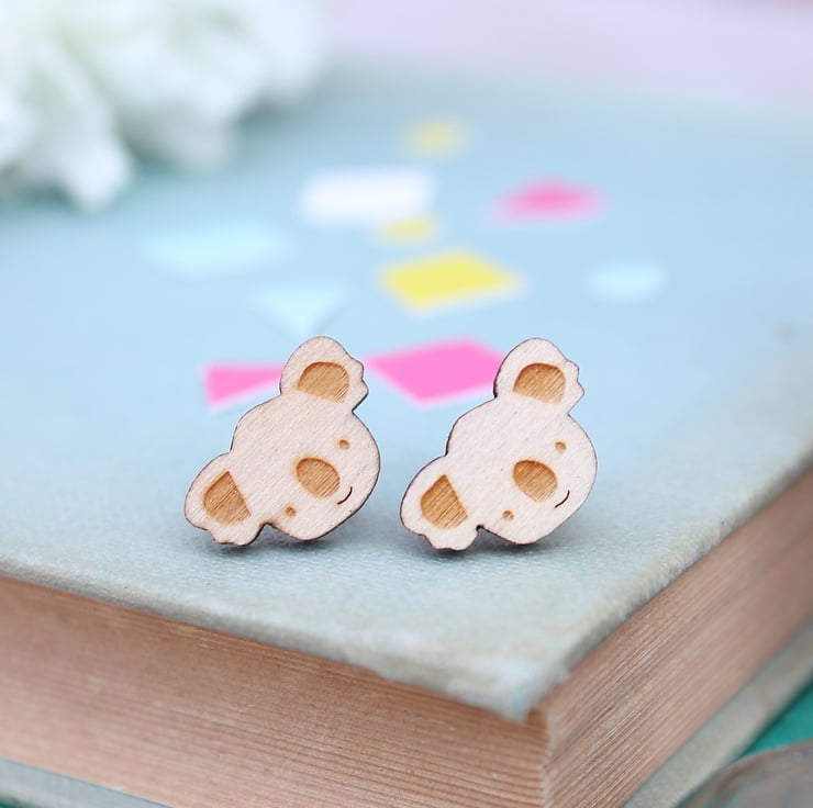 These wooden koala earrings have been laser cut from FSC certified 3mm birch plywood are glued securely to hypoallergenic surgical steel (nickel free) earring posts which are safe for sensitive ears and do not tarnish. The earrings close with a butterfly back and are coated in wood oil to protect the wood and give it a beautiful finish. The wood is FSC certified meaning it's environmentally friendly!