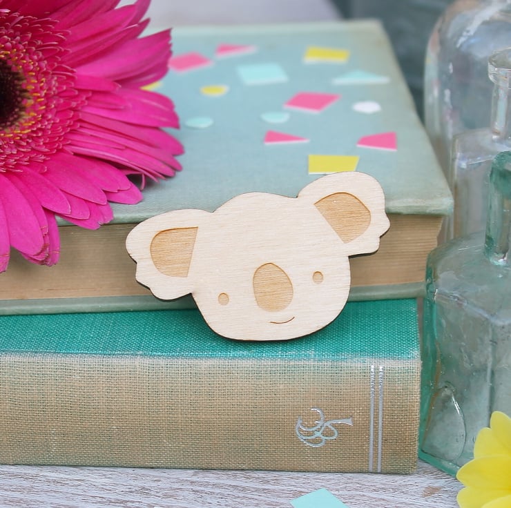 This wooden koala brooch has been laser cut from FSC certified 3mm birch plywood. It is glued securely to a silver plated brooch bar and has been coated in wood oil to protect the wood and give it a beautiful finish. The wood is FSC certified which means it's environmentally friendly!