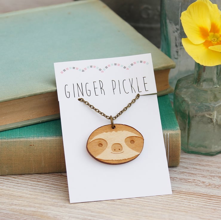 This wooden sloth necklace has been laser cut from environmentally friendly FSC certified 3mm birch plywood and swings on an antique plated cable chain and closes with a lobster clasp. The sloth has been coated in wood oil which protects the wood and gives it a lovely finish.