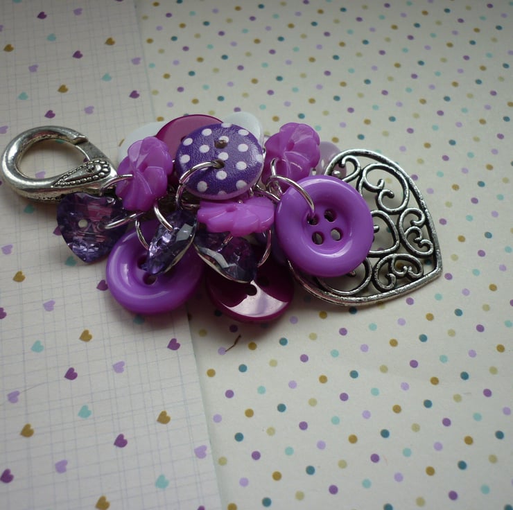 THE HANDBAG CHARM HAS BEEN MADE WITH A LARGE SILVER PLATED FILIGREE HEART ALONG WITH A SELECTION OF ACRYLIC BUTTONS IN SHADES OF PINKS AND PURPLES AND FINISHED WITH A LARGE SILVER PLATED LOBSTER CLASP.
