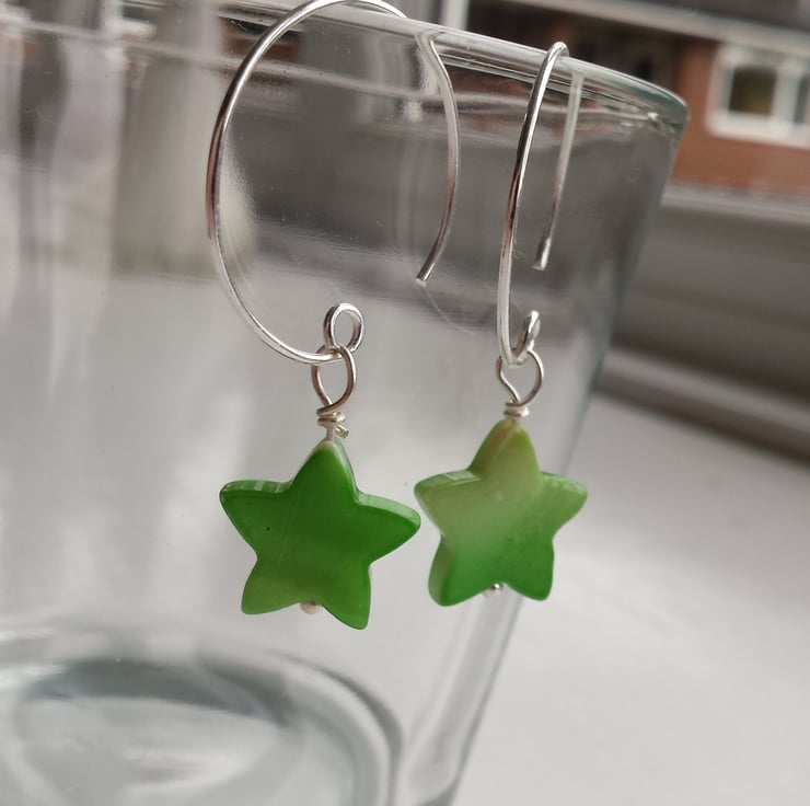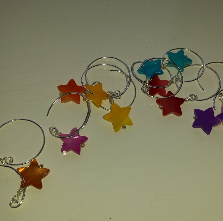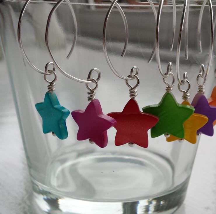 A series of fun summer brightly coloured earrings. They come in 7 different colours: turquoise, bright pink, red, green, yellow, purple and orange and 4 different styles. The stars are 2cm and the hoop 2.5cm. The hoops are silver-plated copper and the stars are coloured shell, as shell is a natural creation I have tried to match the colour as much as possible. They are priced each but are also 3 for 2 across the shell stars, hearts, discs and patterned discs. Order and pay for 2 pairs then put the details for the thrid pair in the notes box (shape and colour), please don't order a third pair as I can't change the invoiced amount.