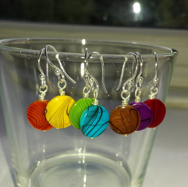 A series of fun summer brightly coloured earrings. They come in 7 different colours: turquoise, burgendy, brown, green, yellow, purple and orange and 4 different styles. The discs are 1.3cm. The earhooks are silver-plated copper and the discs are coloured shell, as shell is a natural creation I have tried to match the colour as much as possible. They are priced each but are also 3 for 2 across the shell stars, hearts, discs and patterned discs. Order and pay for 2 pairs then put the details for the thrid pair in the notes box (shape and colour), please don't order a third pair as I can't change the invoiced amount.