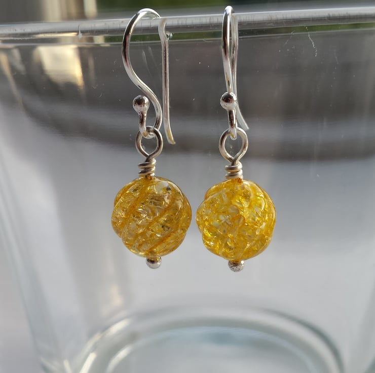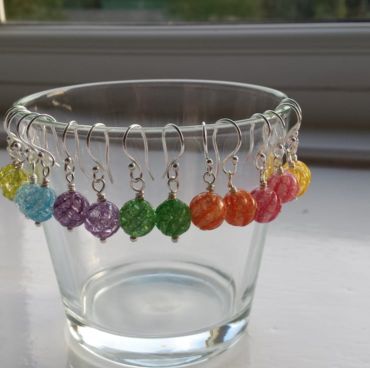 A series of fun summer brightly coloured earrings. They come in 7 different colours: Lime Green,turquoise, bright green, red, yellow, purple and burnt orange. The crackle quartz swirl beads are 1cm in diameter, they are created by super-heating quartz then plunging it in iced water to get the stunning inclusions, then dyed. The earhooks are silver-plated copper. As the beads are created individually I have tried to match the colour as much as possible. They are priced each but are also 3 for 2 across the 7 colours. They must be ordered together, but then wait for me to update the invoice before paying please.