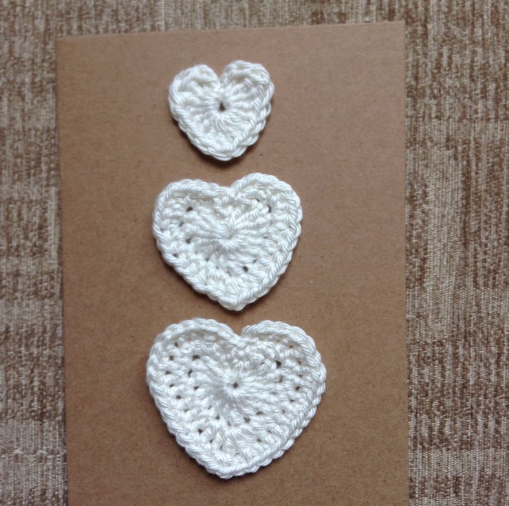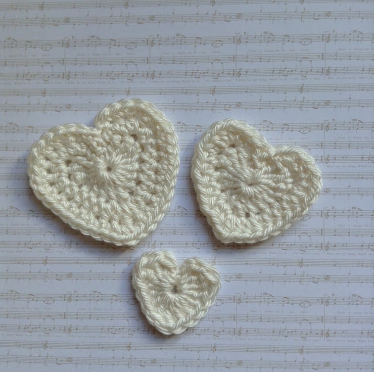 Set of 3 different sized crocheted heart appliqués embellishments in cream 100% cotton yarn.