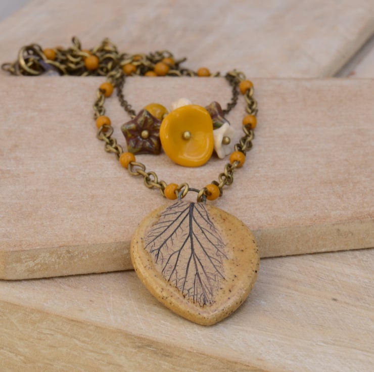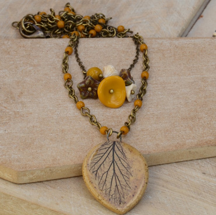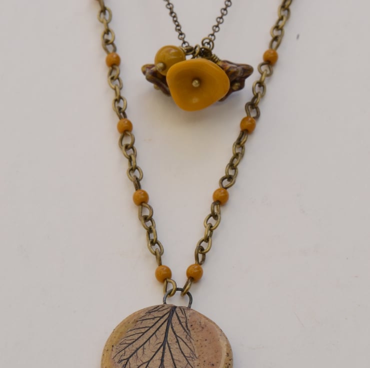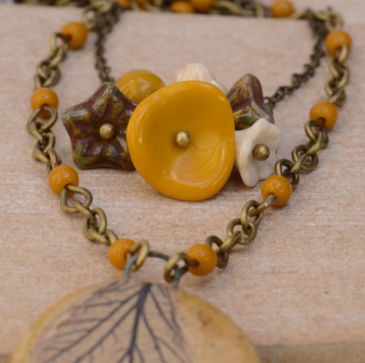 A lovely mustard colour leaf design ceramic pendant is the focal for this layered necklace finished with a beaded chain of mustard Czech round opaque beads. I have used a bouquet of mustard, cream and brown Czech glass beads including flower cups and faceted beads as the focal for the shorter layer fine antique bronze chain to finish with a trigger clasp.