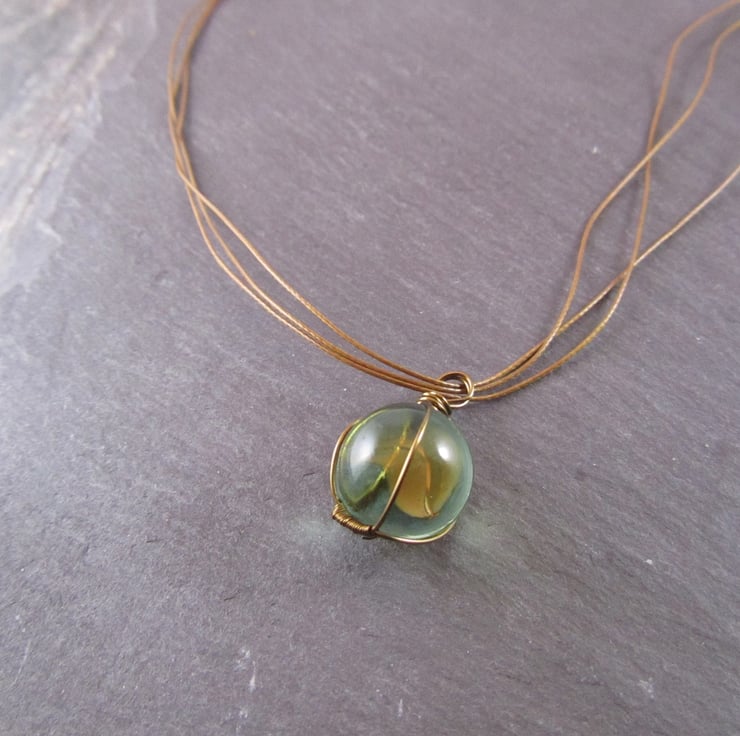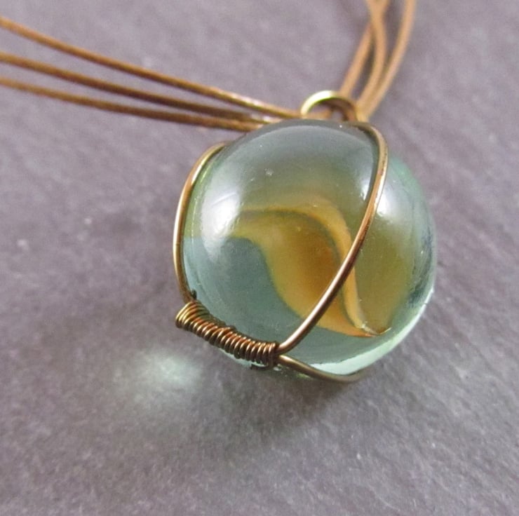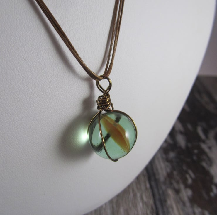 This is a fun brown marble pendant necklace. It is created with a glass marble, antique bronze e-coated copper wire, brown wax cord and antique bronze copper lobster claw clasp.