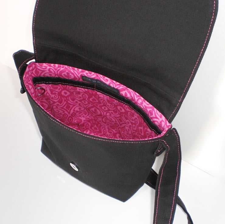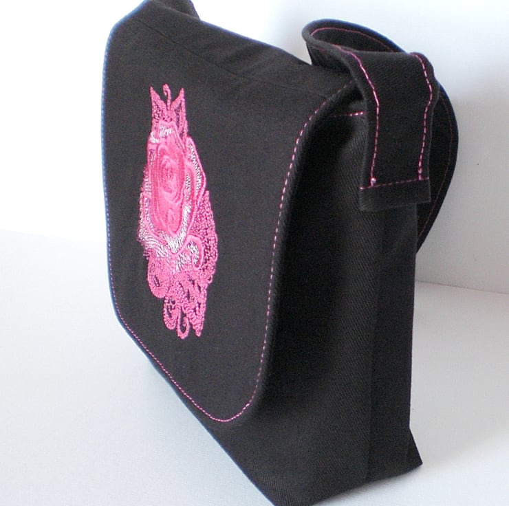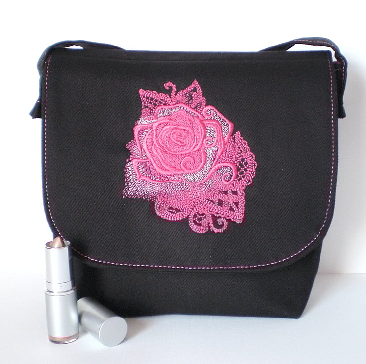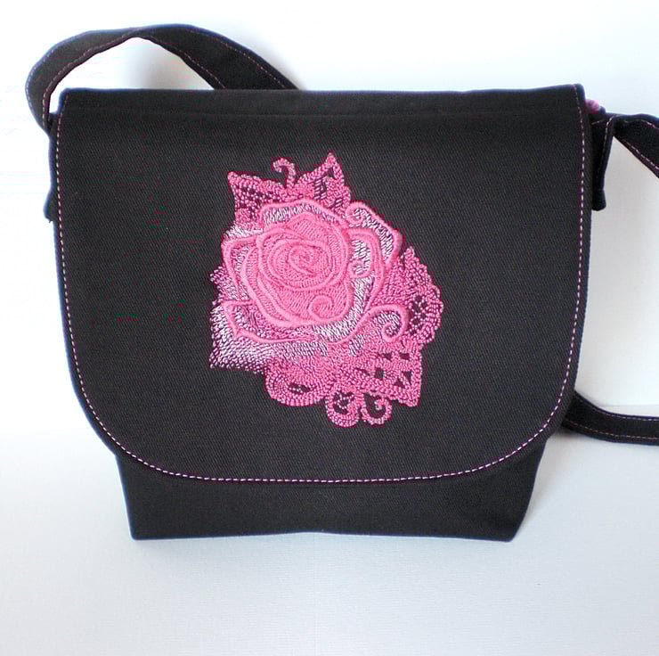 This small size shoulder bag is made in black cotton drill fabric with a beautiful pink rose embroidered on the front flap. It is fully lined with 100% cotton fabric in a pretty pink pattern.