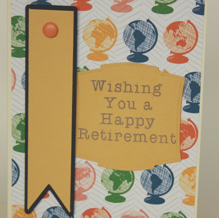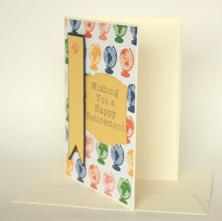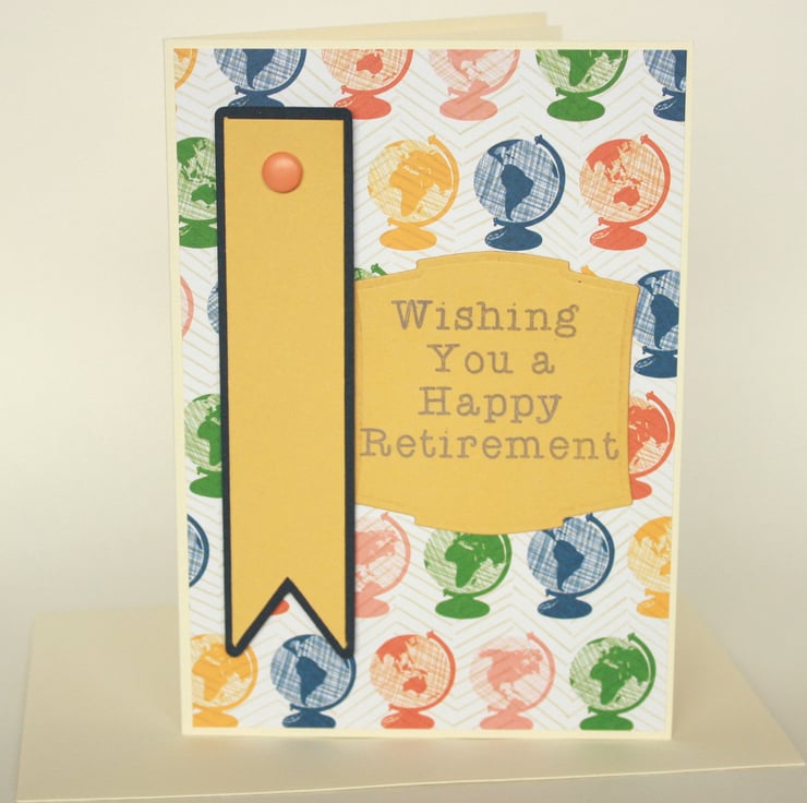 Simple, cream, A6 retirement card featuring a multi-coloured globe background. Perfect for geography teachers, travel agents, or someone who is going to spend their retirement travelling the world.