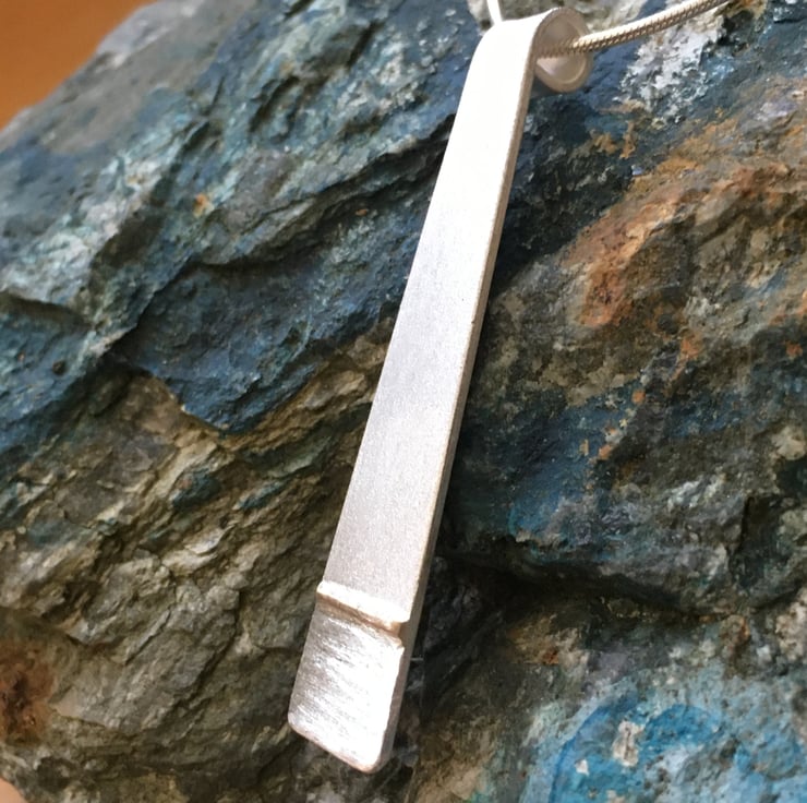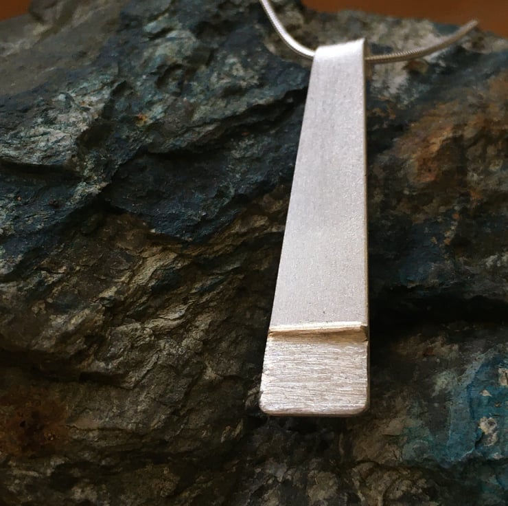 'Porthtowan Sunset' pendant. 100% recycled sterling silver with brushed finish at the top, a 9ct gold strip and sparkle finish silver below, symbolising the sun setting over the sea. Supplied with 18inch sterling silver snake chain. Inspiration taken from the beautiful sunsets at Porthtowan when the sea sparkles as the golden sun slips below the horizon. Approx 40 x 10mm.
