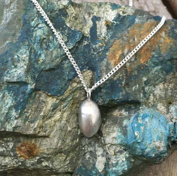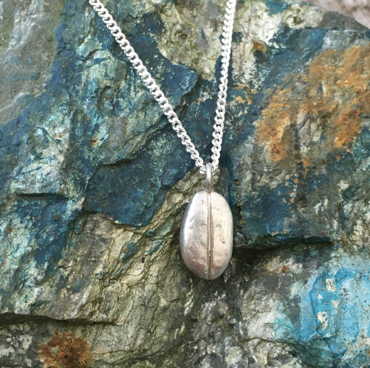 A beautiful silver pendant, using a handcrafted nugget of silver shaped as a coffee bean.