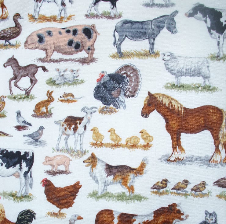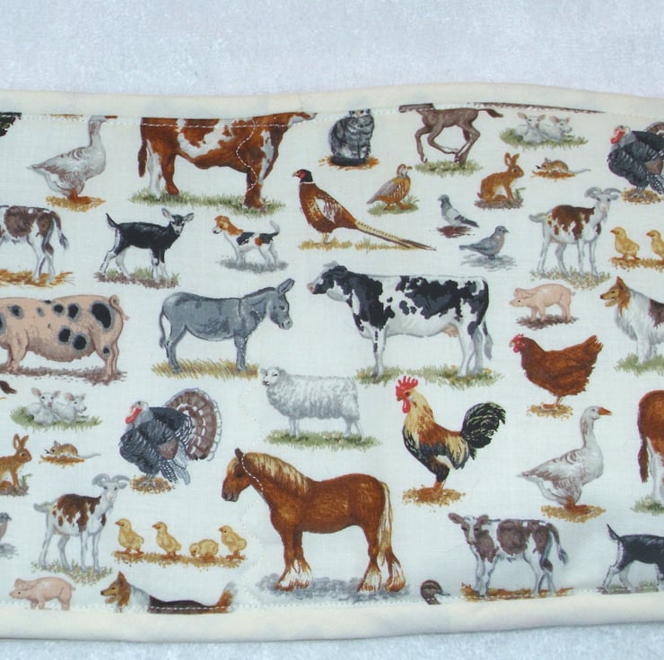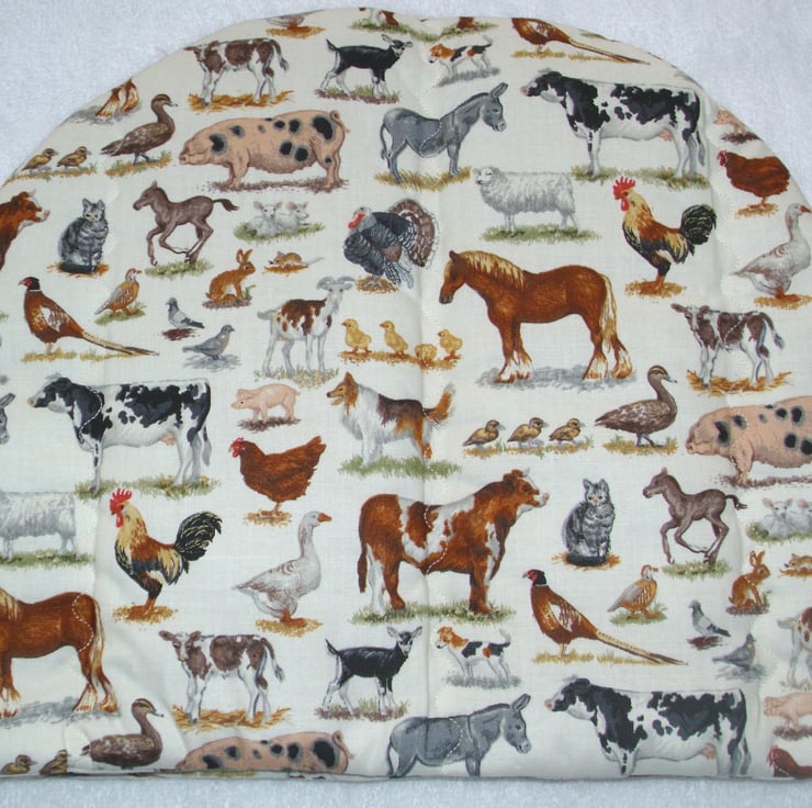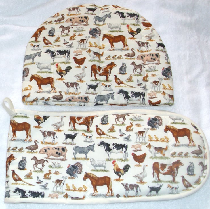 On the farm tea cosy and oven gloves set with Shire Horses, Cows and calves, Sheep and Lambs, Goats and Kids, Chickens and Chicks, Ducks and Ducklings, Donkeys, Turkeys, pheasants, field mice, Rabbits, Jack Russels, grey Tabby cats, pigeons and pigs . .32 cm wide , 25.5cm high ,will keep tea hot for up to half an hour after you make it ,oven gloves are lined with heatproof material and are ideal to use with oven or microwave cooking, fully washable .