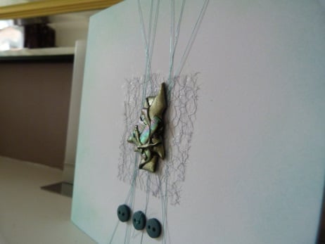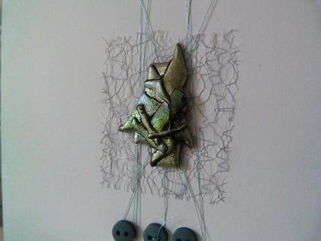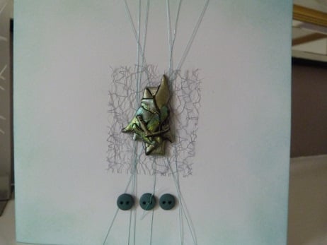 A completely handmade and uniquely designed card. Consisting of quality pristine white card which has been shaded green. A unique topper handmade from meldable plastic in gold, blue and green. Mounted onto a square of silver web, green iridescent thread has ben twined around the card and finished off with three green buttons.