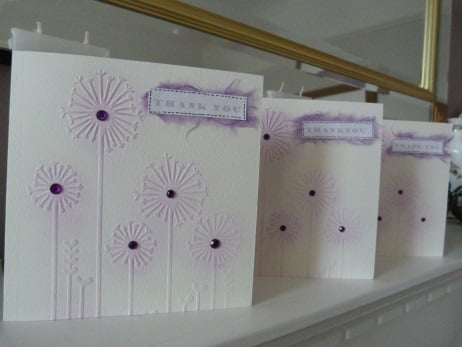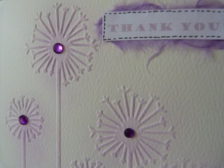 A pack of 3 thank you cards, all the same design and colourway. Ivory textured card which has had a pretty dandelion design embossed. The heads have been shaded lilac with purple rhinestone centres. Finished off with thank you mounted onto lilac mulberry paper.