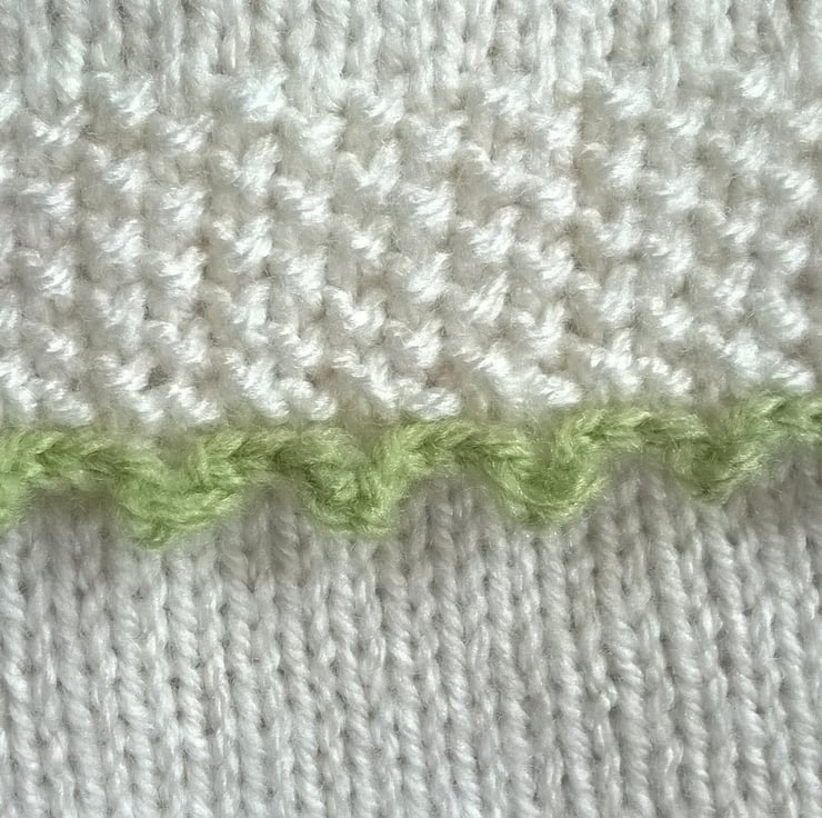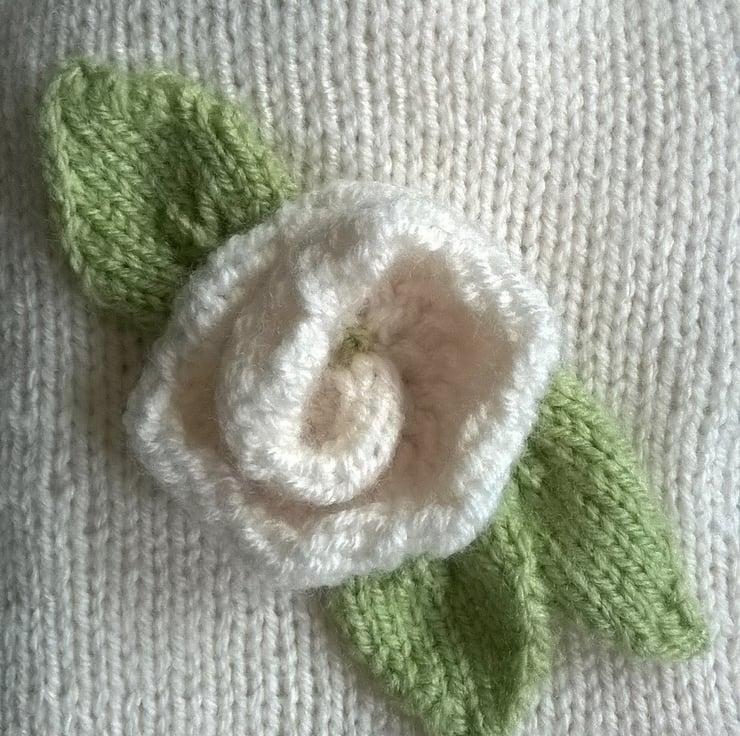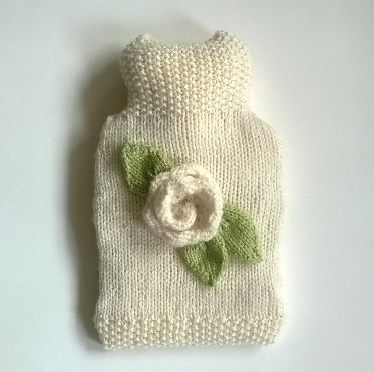 A ladies hot water bottle cover hand knitted in cream yarn. The front is embellished with a knitted cream rose and 3 spring green leaves. The envelope style opening at the back is knitted in moss stitch and finished with a matching spring green crocheted picot edging. The bottom of the cover and the top above the neck are also knitted in moss stitch, adding a gentle texture to the design.