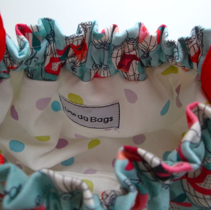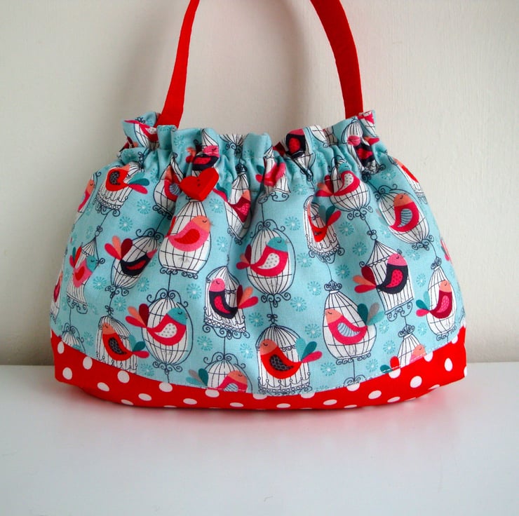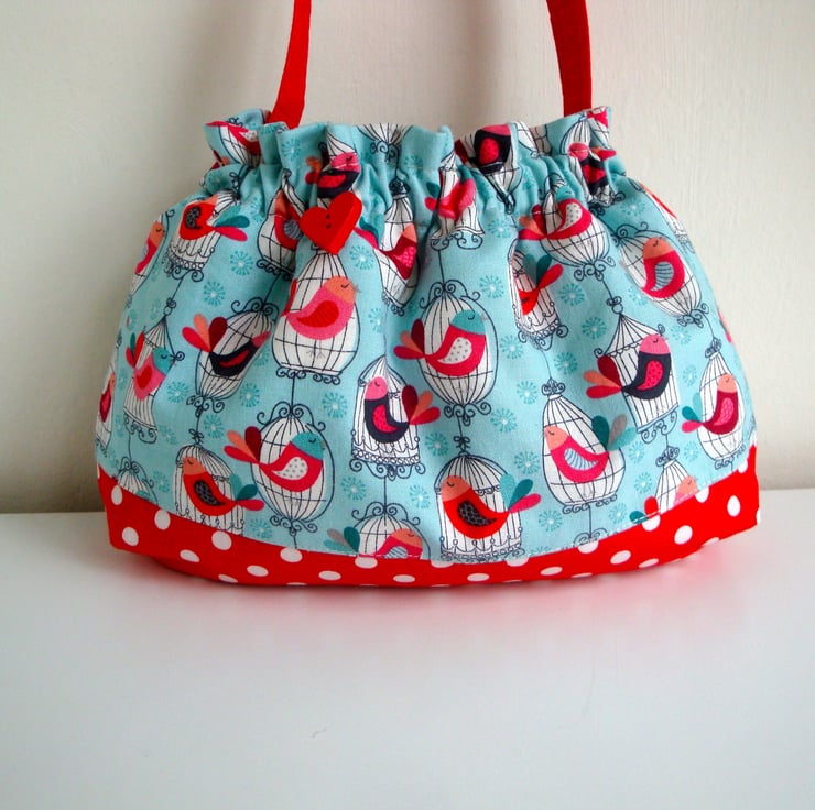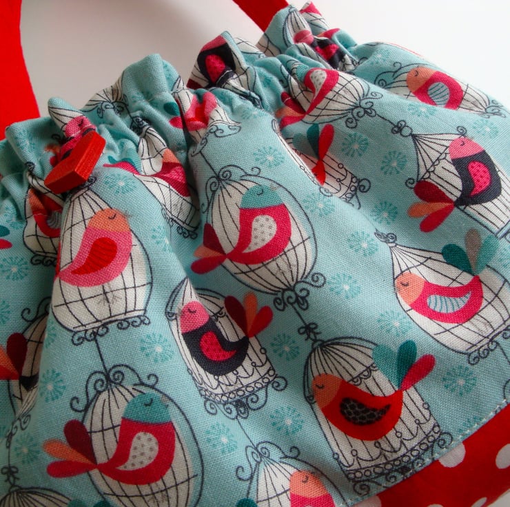Bag is made in two pretty cotton fabrics , a red polkadot ...and a printed birdcage fabric.