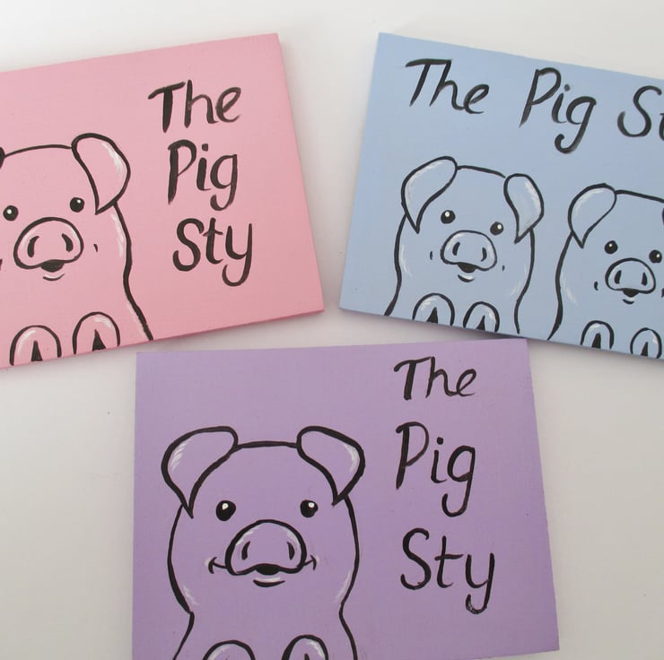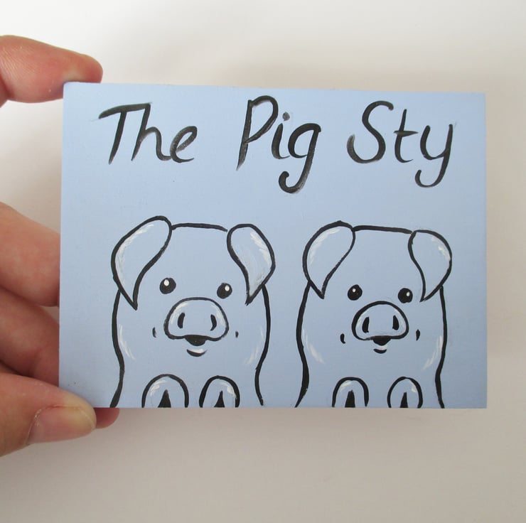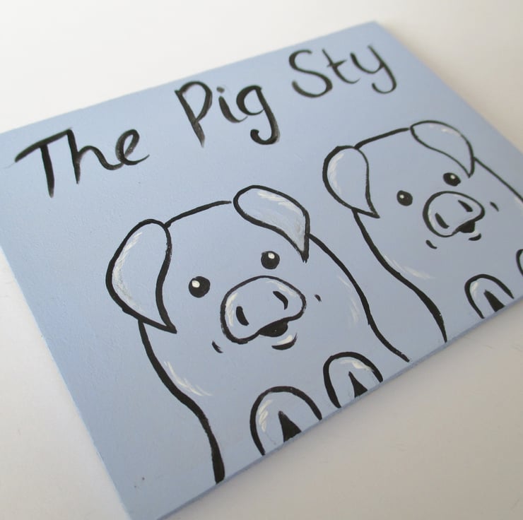 This listing is for a 3 x 5" MDF door sign reading 'The Pig Sty' with two cartoon line drawings of wee piggies on it. The background is blue.