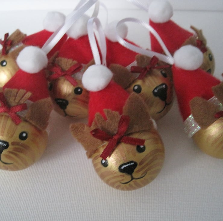 They are painted in acrylics, with home made Santa hats, complete with pompom. The standard hat colour is red, with pearly white ribbon trim and white pom pom, but if you prefer another colour hat / trim to co-ordinate with your other decorations that can also be done.
