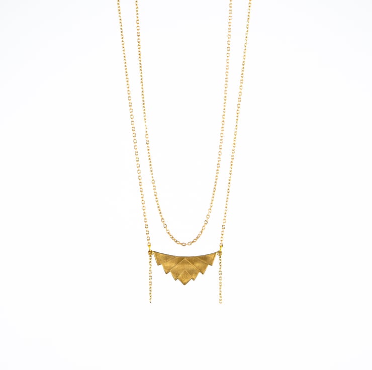 Two fine gold chains hang at slighly different lengths just below the collarbone. The longer chain is fixed to an art deco style centrepiece made from raw brass giving it a slightly matte effect.