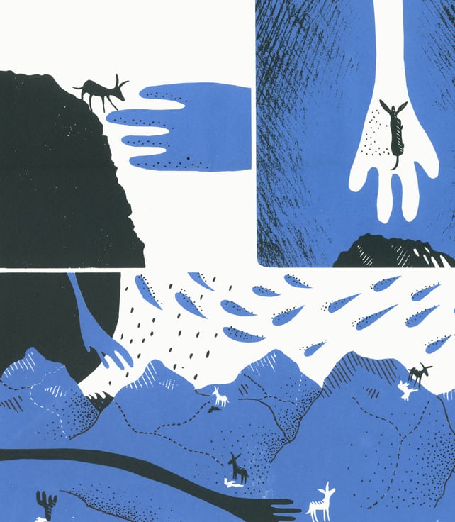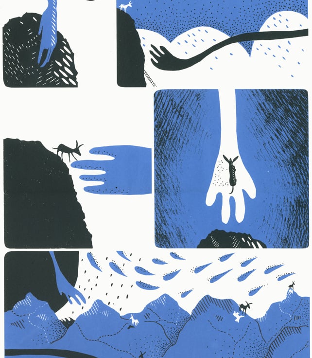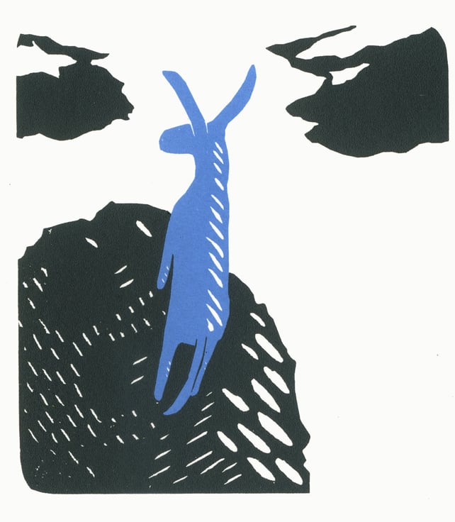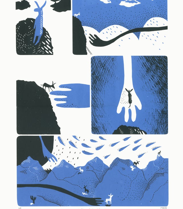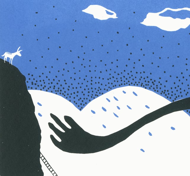 This print is a 'kind of' sequel to my 'Blue Donkey Regrets The Adventure' print, and it tells the story of how the donkey gets down from the mountain that he is stuck upon.