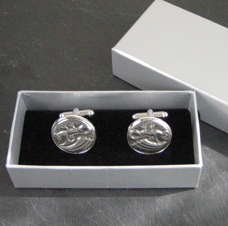 A pair of rampant dragons in shiny modern pewter. A great gift for a fan of fantasy games and films such as Game of Thrones or Tolkien. Each link measures 21mm across and has been hand-crafted in lead-free pewter. Presented in a smart grey gift box. A great gift for a man for a 10th Wedding Anniversary or Birthday.