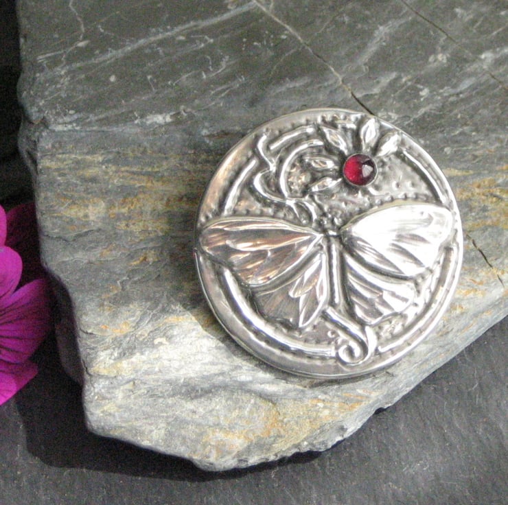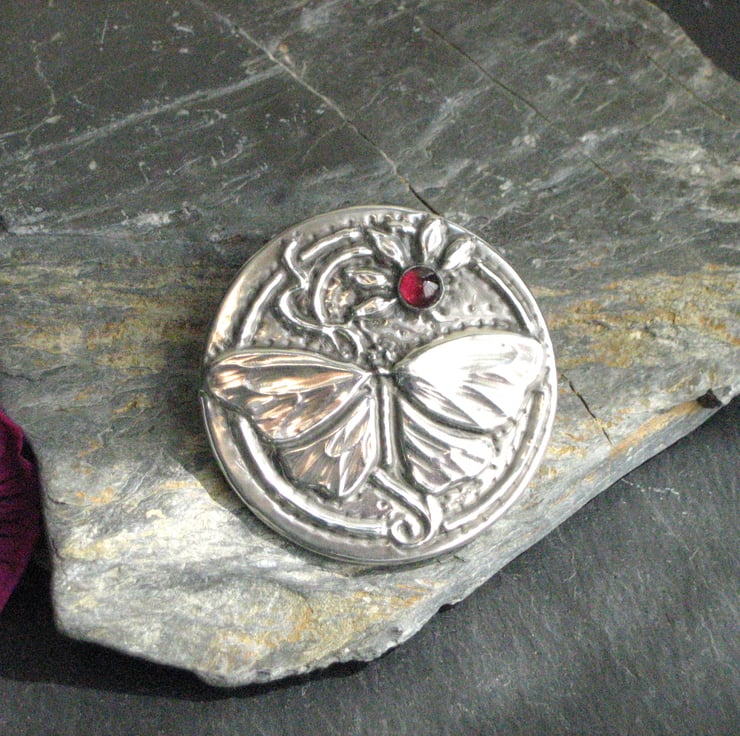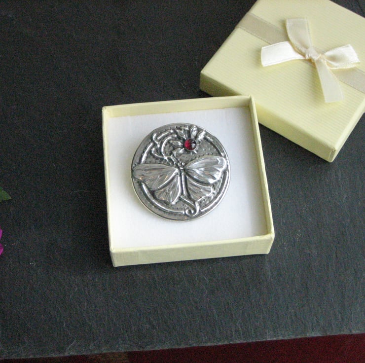 Last minute gift.A beautiful gleaming brooch with a rich red garnet, handmade in the Arts and Crafts tradition in shiny lead-free pewter. It measures 37mm diameter and has a 25mm pin with safety catch on the reverse. In spite of its size, it is light in weight. Gift boxed (may differ from that shown). A special gift for a woman for a 10th Wedding Anniversary, Birthday or any other special occasion.