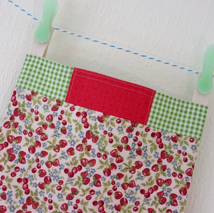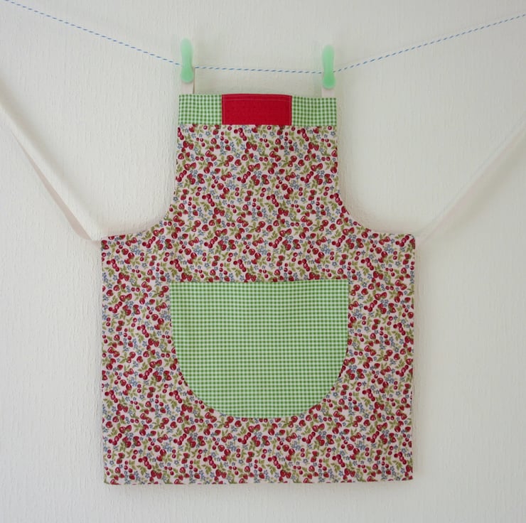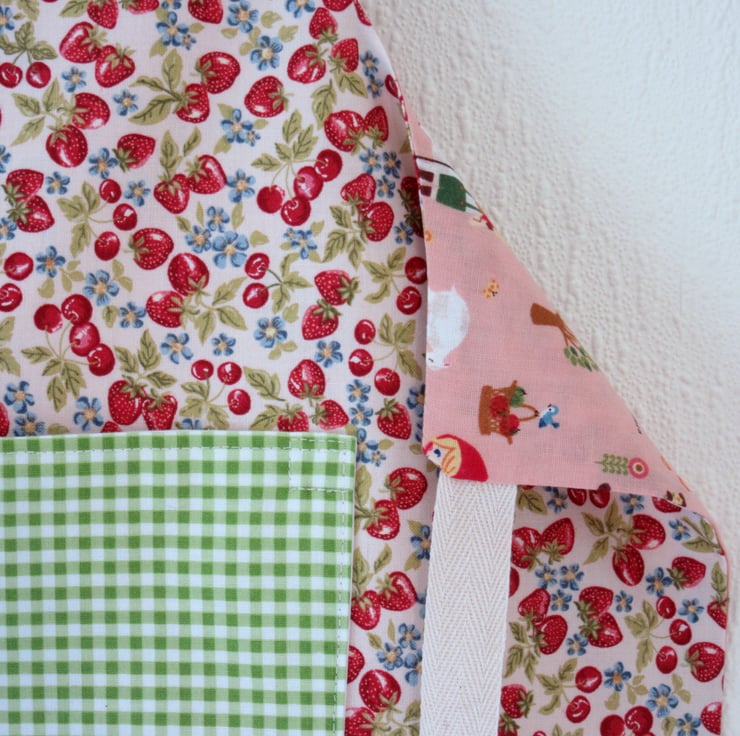 This reversible apron combines two beautiful little prints - Red Riding Hood on one side and strawberries on the other - with a crisp green and white gingham for the pocket. What side will your child wear today.