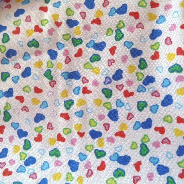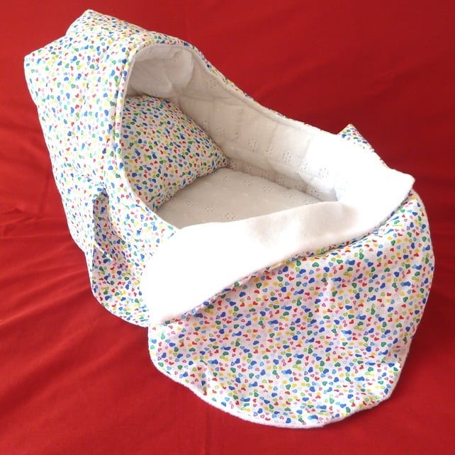 This delightful dolls carrycot is made from polyester cotton fabric which has a small mult-coloured heart design, it is lined with white broderie anglaise and polyester wadding.
