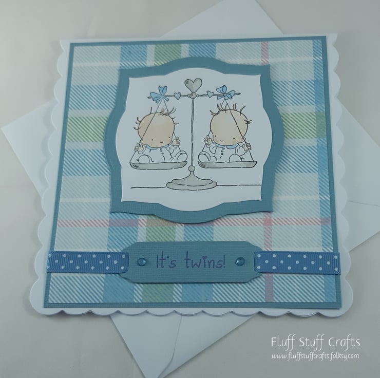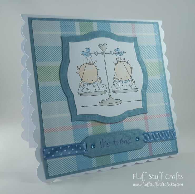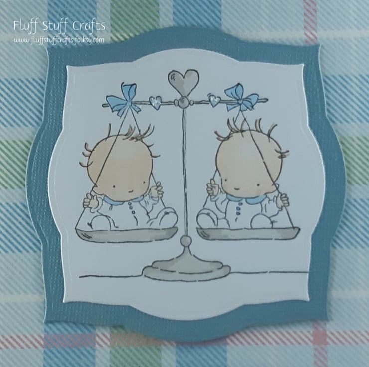 Square scalloped card featuring a hand stamped and coloured image of twin babies on a set of scales. The image has been matted onto blue card and again onto a blue tartan background.