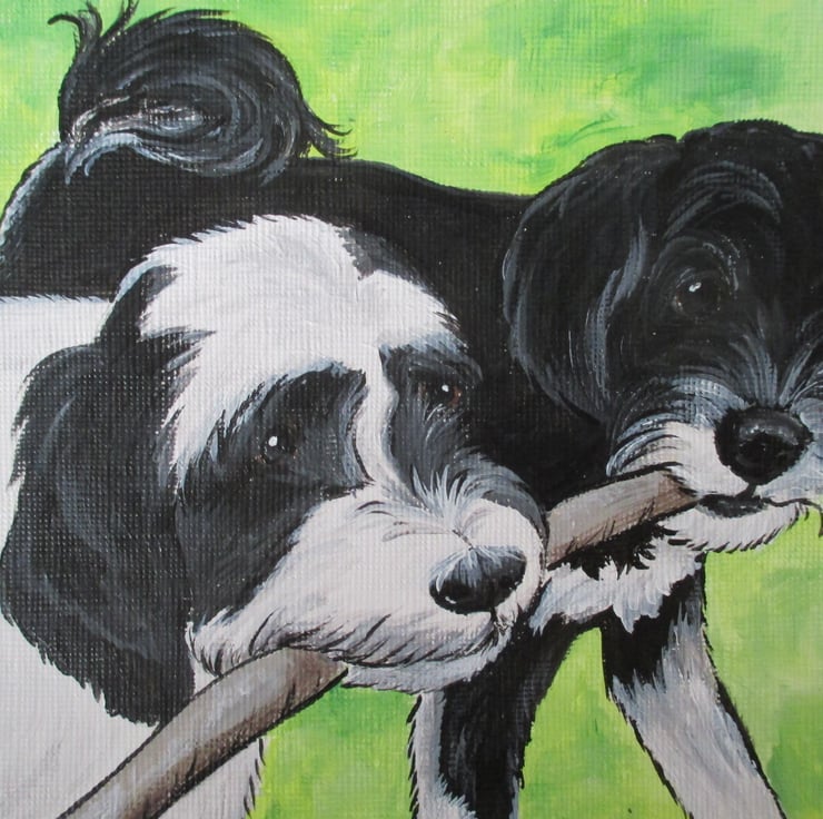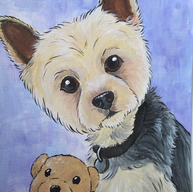 Custom pet portrait, painted in cartoon style in acrylics on acrylic 7 x 5 inch canvas paper. Simply email me the photo you want painting of your pet, and I will paint you an original portrait. You can have extra details added to suit your pet's personality (see photographs for examples).