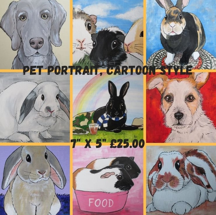 I specialise in rabbits and guinea pigs, but have also done cats, dogs, mice, hamsters, rats, parrots etc. I will do any animal, but sorry, no humans.