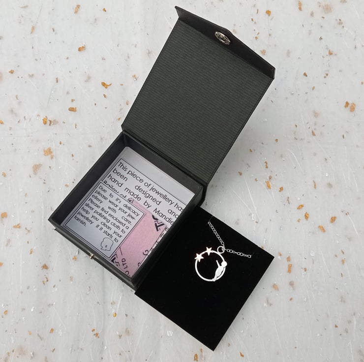The necklace will arrive in a black jewellery box, complete with simple care instructions and a small square of silver polish.
