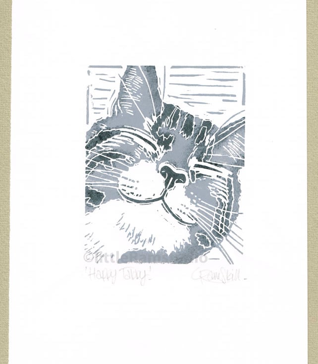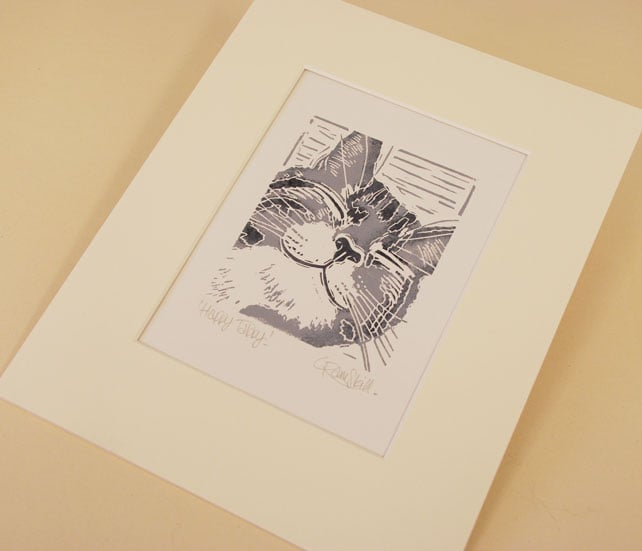 Grey Tabby Cat linocut print titled 'Happy Tabby'.