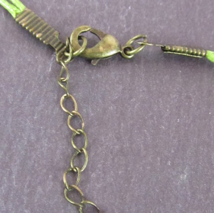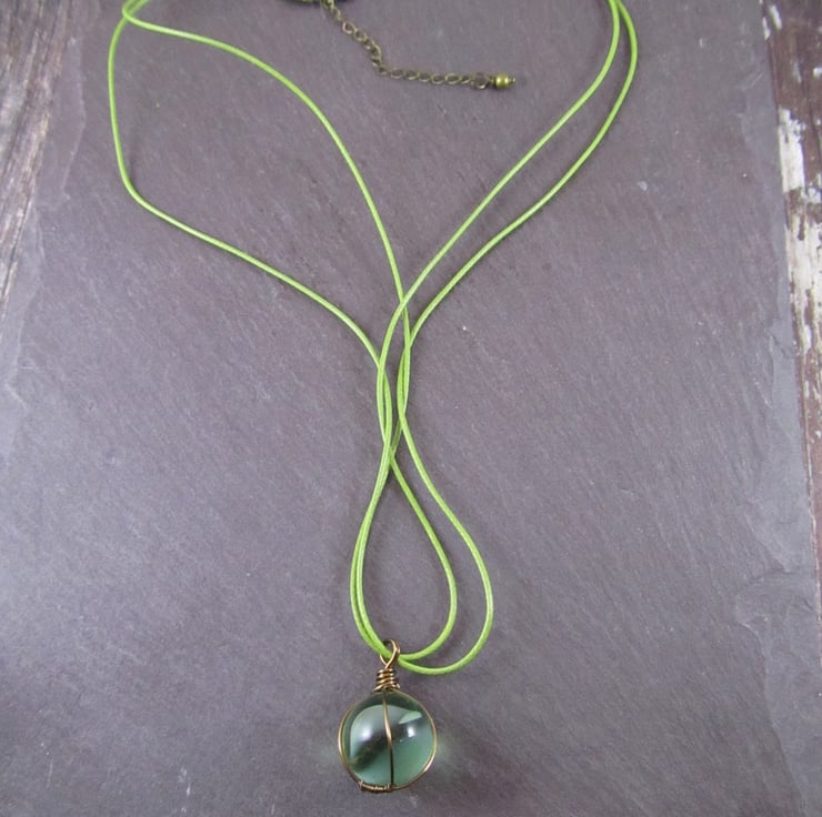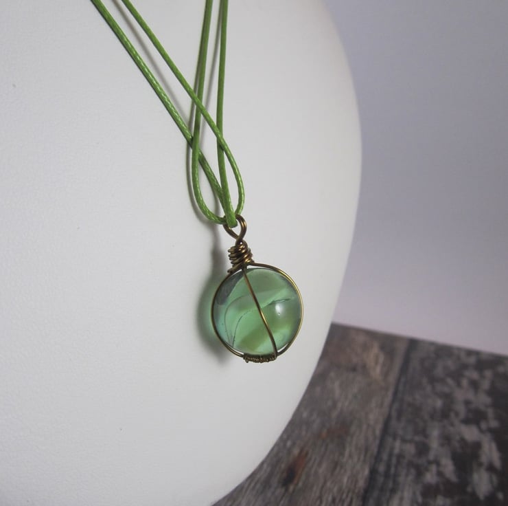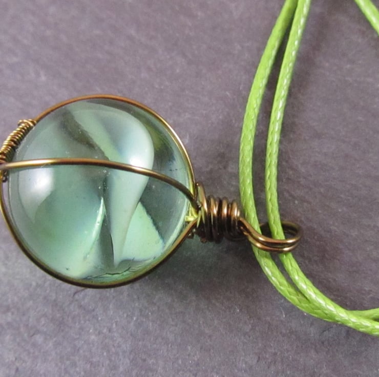 This is a quirky light green marble pendant necklace. It is created with a glass marble, antique bronze e-coated copper wire, green wax cord and antique bronze copper clasp.