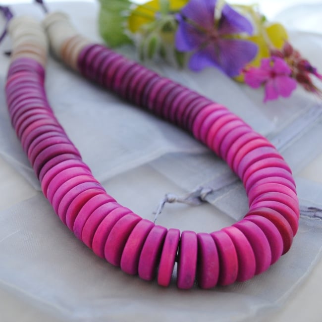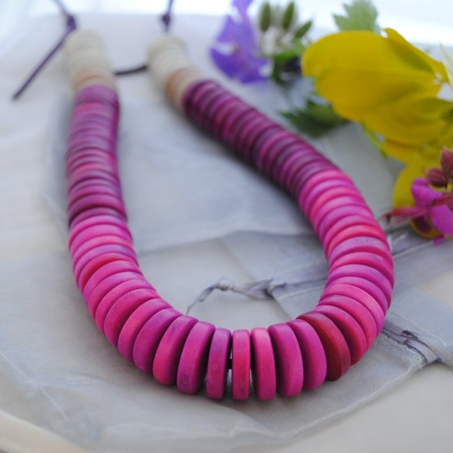 Large scale casual summertime necklace made with natural wood beads - called coco-pucalet - in a heshi shape strong on faux purple suede. Despite the large scale beads the necklace is light and easy to wear. The beads are arranged in colour blocks of grape, purple, sand and cloudy grey,