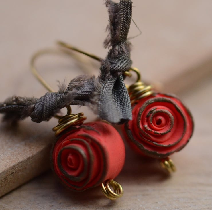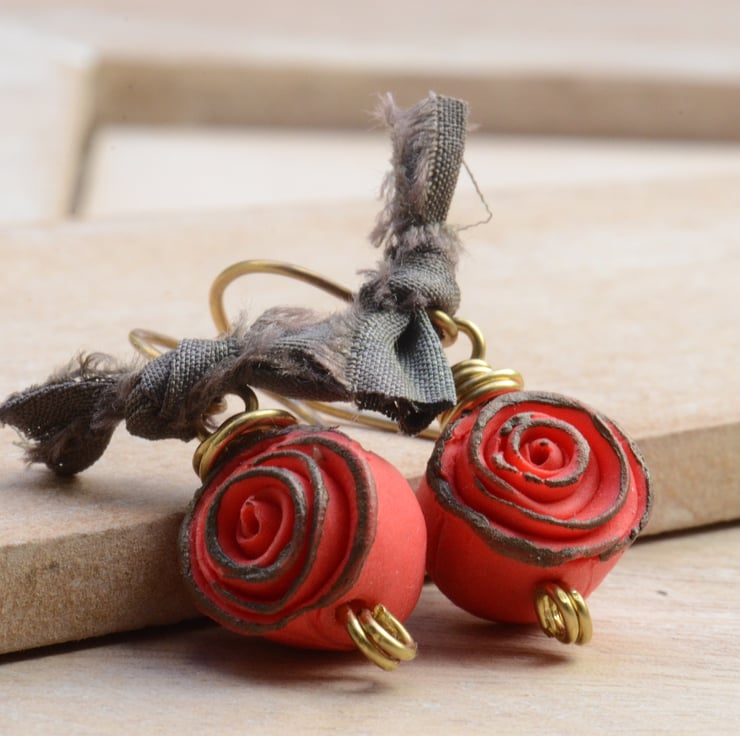 Lovely polymer clay rose beads are the focal for these earrings which I have teamed with little dark grey bows of sari silk ribbon and handmade brass earwires to finish.