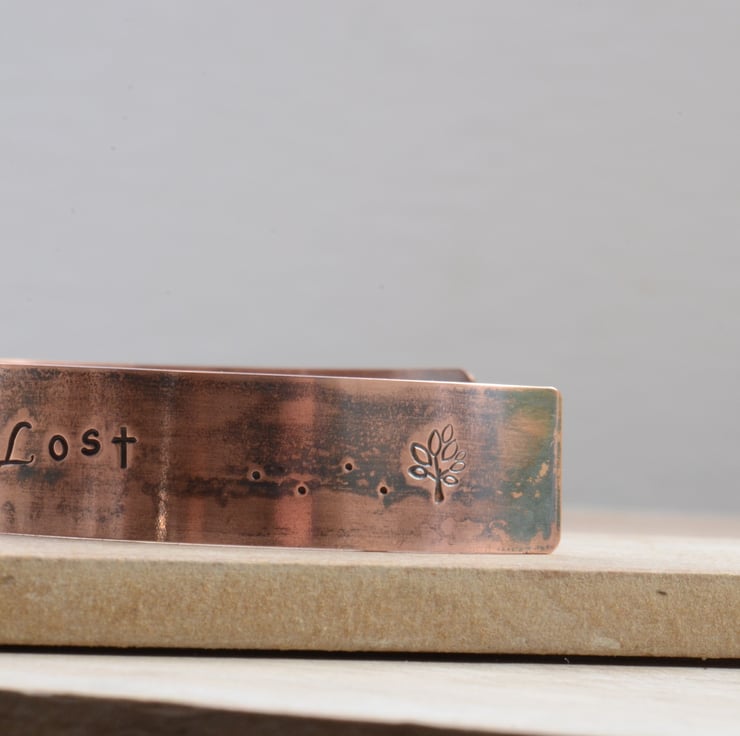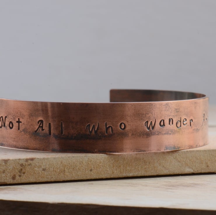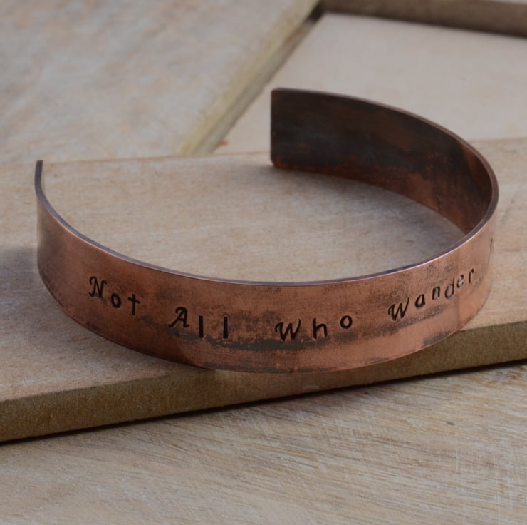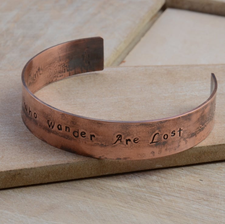 I have used a copper cuff blank and hand stamped the words "Not All Who Wander Are Lost" and added little tree designs at each end.